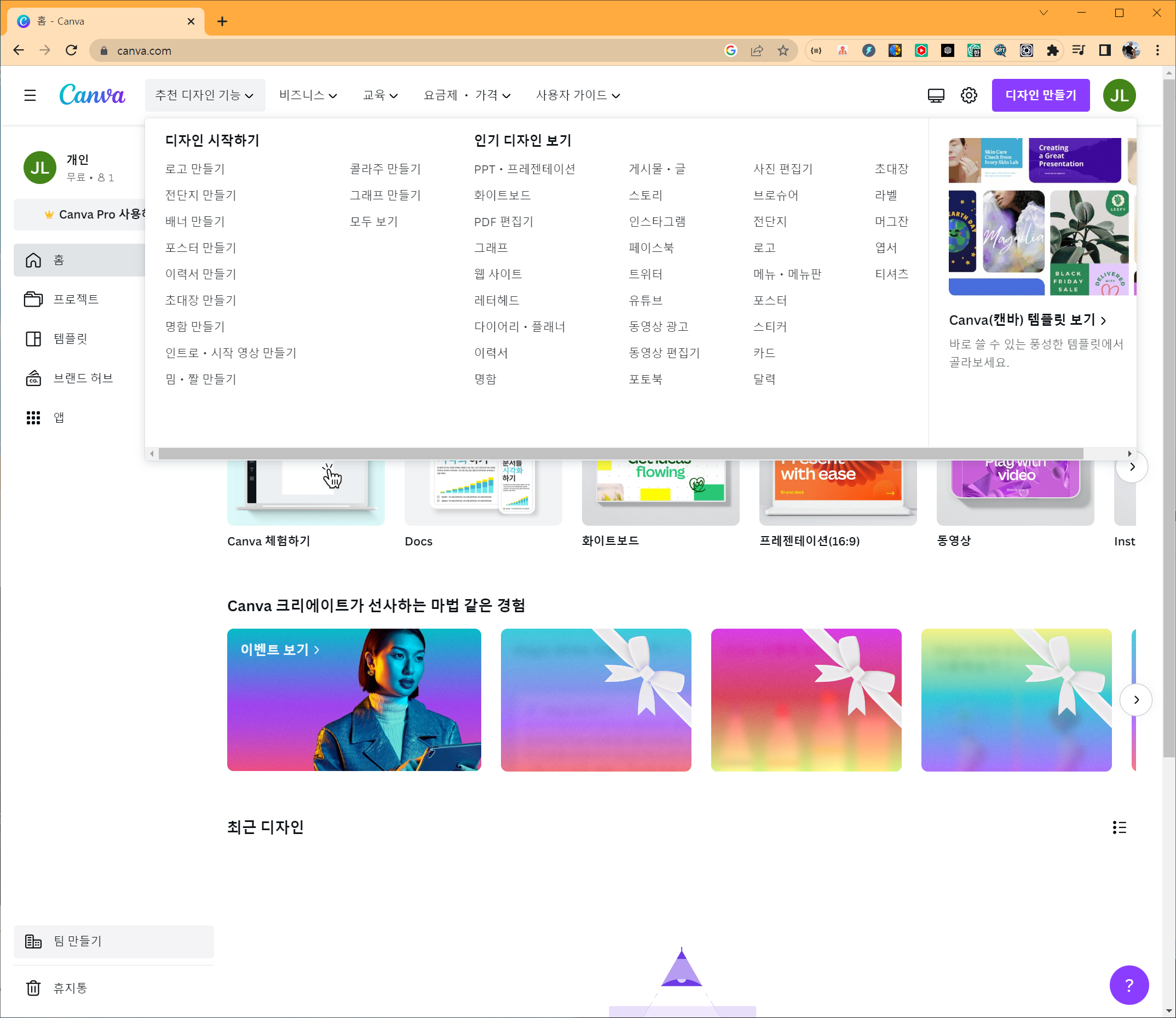 Canva의 가장큰 장점은 비전공자도 쉽게 접근이 가능하고 템플릿을 통해 빠른 결과를 볼수 있다는 것입니다.