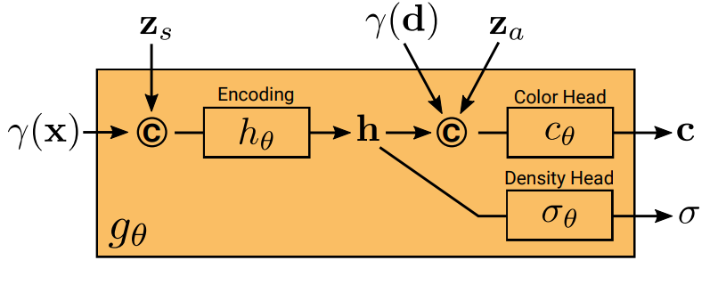 각각의 point당 에 query하여 density와 RGB값을 구함. 이때 apperance code와 shape code도 오른쪽 그림과 같이 input 됨. 결국 다음과 같은 함수임! 그저 3D좌표와 direction, code를 받으면 RGB랑 density를 output함.