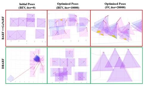 DBARF는 번들 조정(bundle adjustment)이라는 고전적인 컴퓨터 비전 기술을 NeRF에 통합하여, 신경 방사장이 새로운 장면에 대해 더 잘 일반화되도록 합니다. 번들 조정은 카메라의 위치와 방향을 최적화하여 3D 재구성의 정확성을 향상시키는 기술입니다.