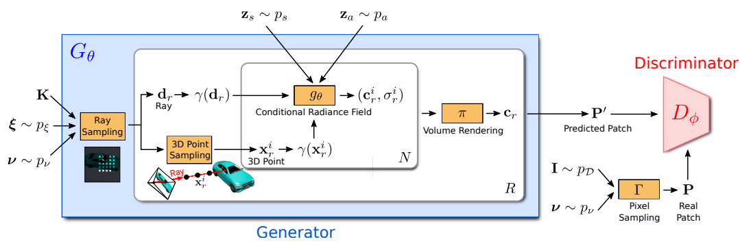 기본적으로 Generator와 Discriminator가 존재하는 GAN 아키텍처를 사용하는데, generator에서 2D 이미지를 생성하기 위해서 Radiance Fields를 사용한다. 이때 다음과 같은 점에서 NeRF setting과 조금 다르다.