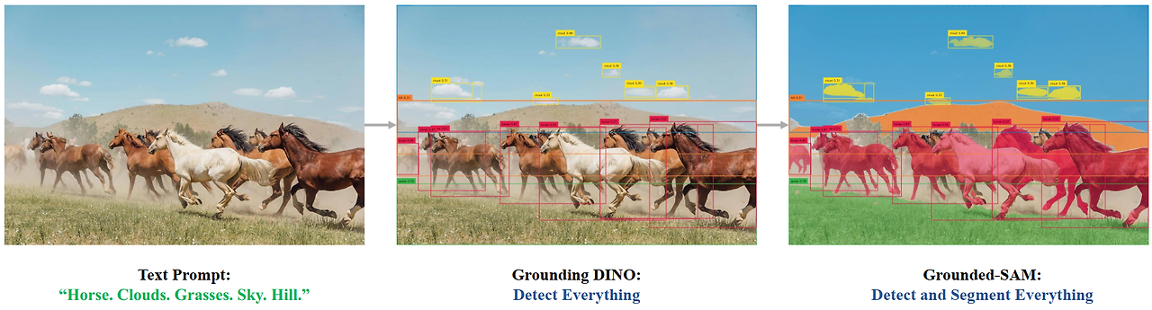 우리는 텍스트 입력으로 무엇이든 감지하고 분할하는 것을 목표로 하는 Grounding DINO 와 Segment Anything을 결합하여 매우 흥미로운 데모를 만들 계획입니다 ! 그리고 우리는 계속해서 이를 개선하고 이러한 기반을 바탕으로 더욱 흥미로운 데모를 만들 것입니다. 그리고 우리는 이미 arXiv 프로젝트에 대한 전반적인 기술 보고서를 발표했습니다. 자세한 내용은 Grounded SAM: Assembling Open-World Models for Diverse Visual Tasks를 확인하세요.